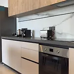 Des Weiterem gibt es einen Toaster und einen Herd in einer voll ausgestatteten Küche. Die 90 m^2 großen 201 Lux Suite Tower206 ist in ca. 5 Gehminuten Entfernung von der Bushaltestelle Kykladon - Aigaiou.